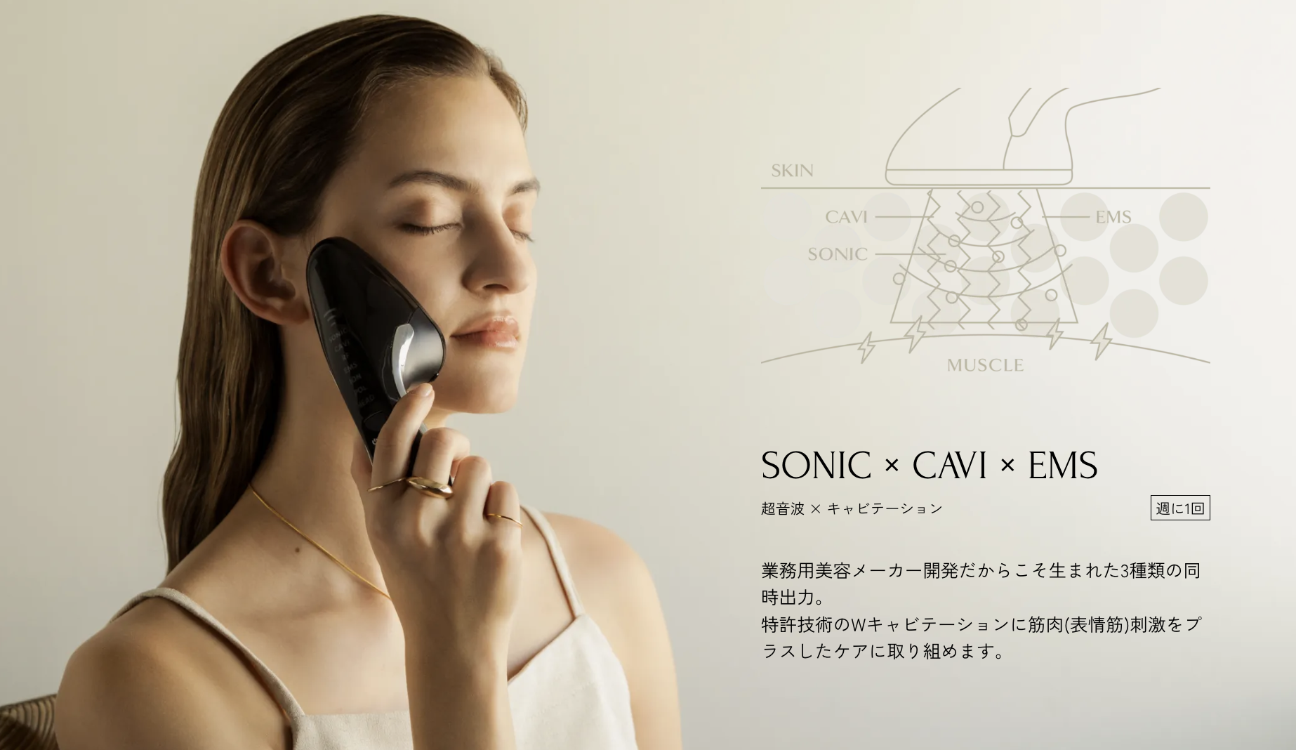 | エレクトロポーション | 電気の力を利用して、イオン導入では難しかった分子の大きな美容成分もダイレクトに角質層へ届ける | キャビテーション | 特殊な超音波(キャビテーション)で脂肪細胞を遊離させ、部分痩せケアができる | ローラー | ローラーを転がすだけで表情筋のケアが行える |